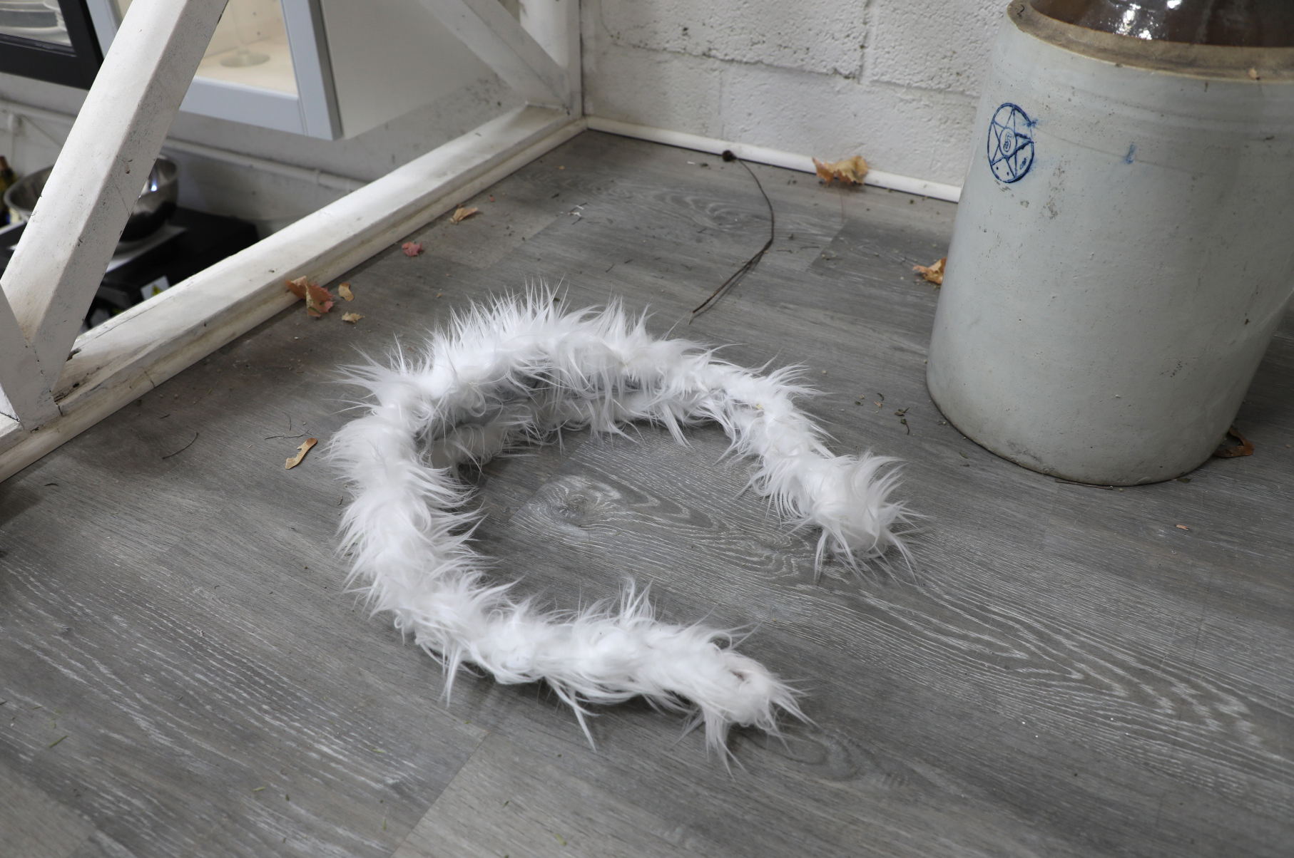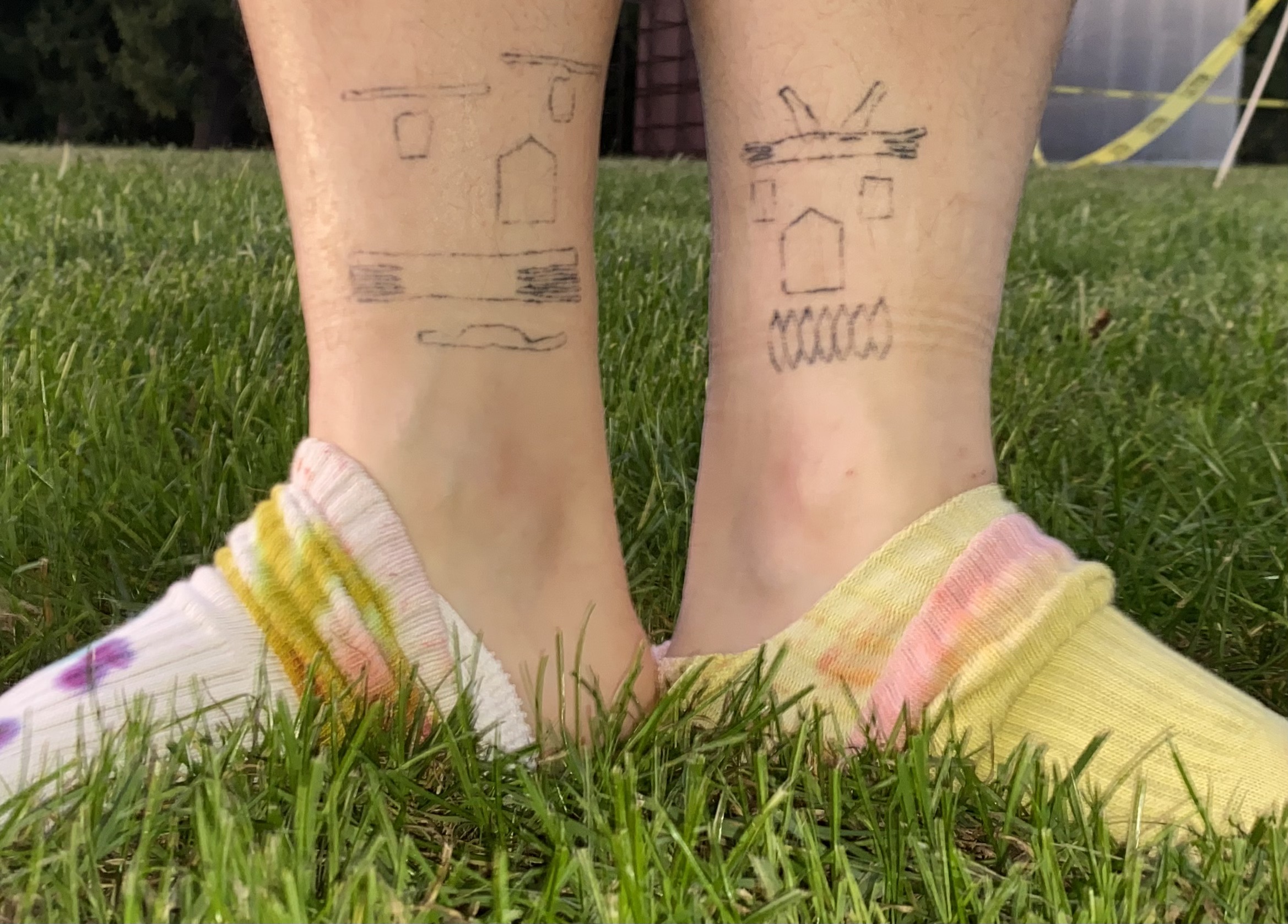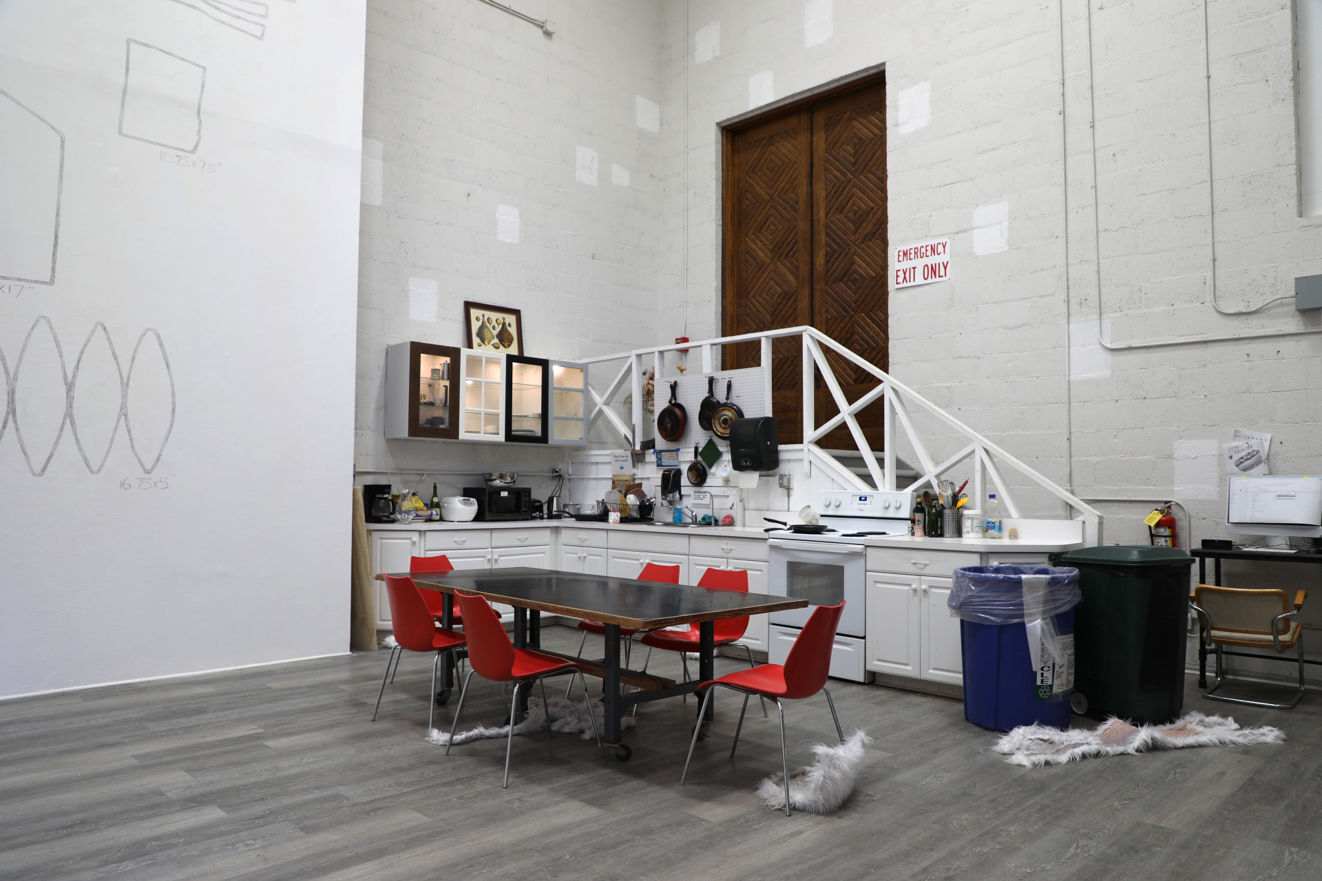 Taken-apart white faux fur rabbit outfit, lined with inkjet print images collecting the red bunny drawings on my body papier-mâché cast into the shape of objects in the space, clothing pins, inkjet print of Google Calendar on top of a computer screen with Google Calendar opened, graphite on wall tracing blown up clothing pattern used to create original rabbit outfit (with original scale annotated), wall paint in pixelated squares around all the walls in the space. February 6, 2024.