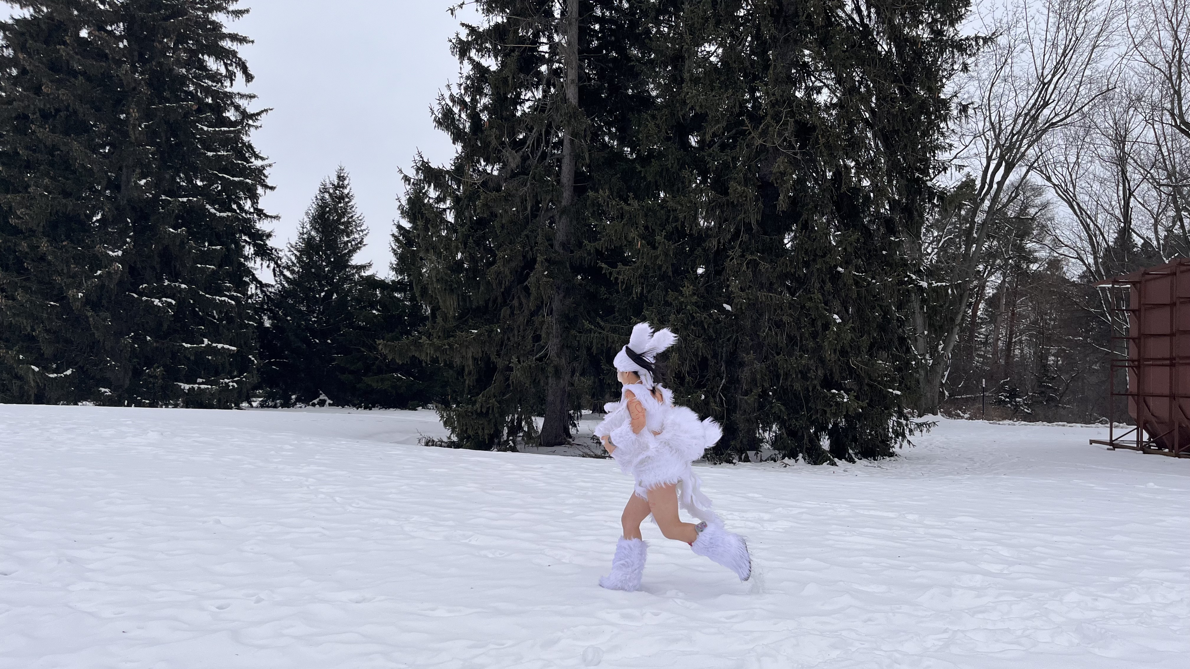 Rabbit prosthetic, white faux fur, white face paint, black eyeliner, red lipstick, furry soapbox, furry scroll with inkjet print of paper rabbit fun facts relating to the Chinese New Year, accumulated red Sharpie mark in exchange with every rabbit fun fact delivered. January 22, 2024.