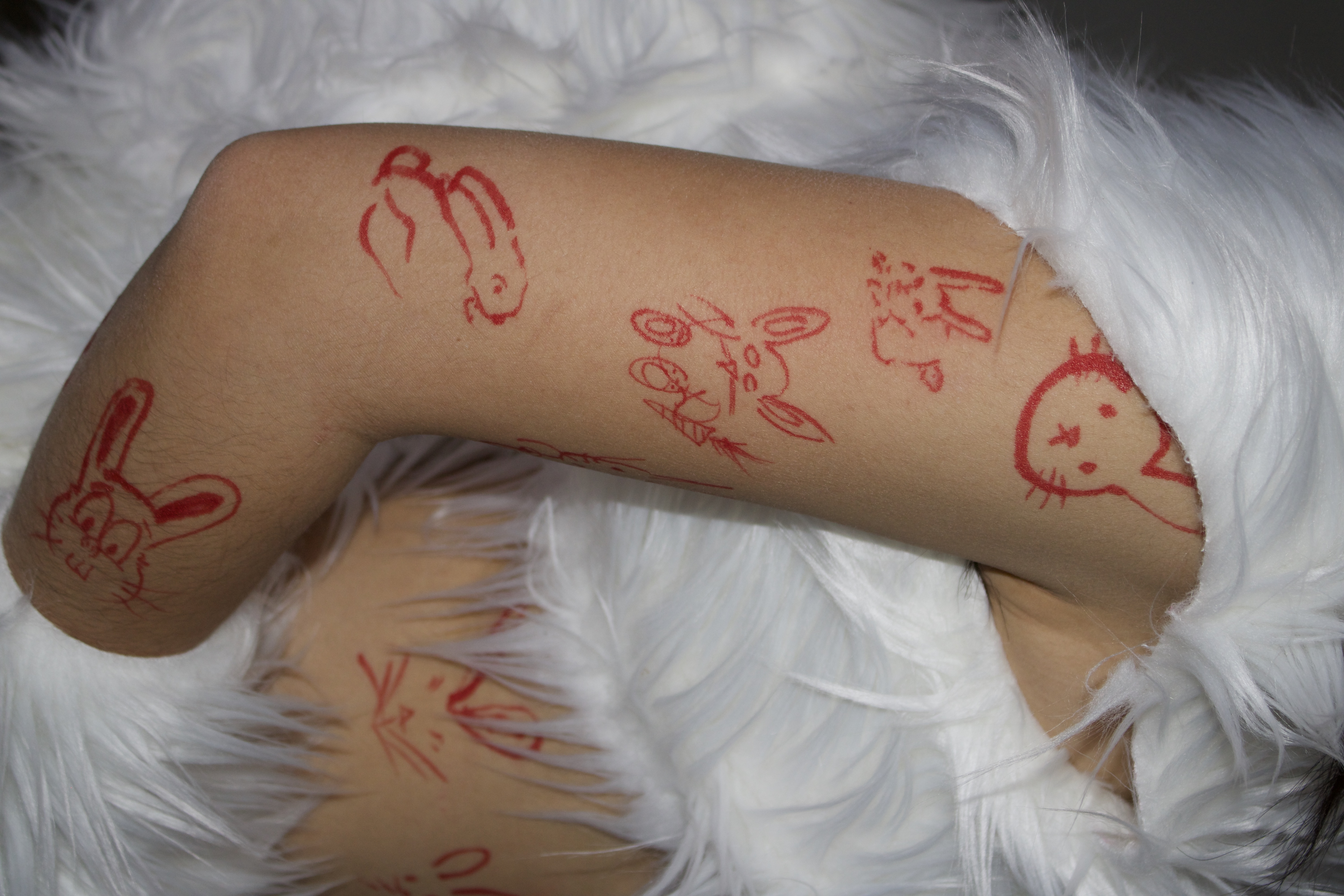 Just before the end of my Zodiac Year – the Rabbit Year – I dressed as a rabbit and ran around telling people fun facts about Rabbit Year and the people born within it. Reading from a furry, printed script, I would offer superstitions like “people who are born in Rabbit Year, lucky numbers are 3, 6, 9 and direction of East,” and in exchange, I provided a red sharpie and let people draw a bunny on me.